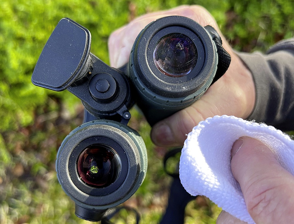 Im Revieralltag haben wir das Tuch bei Regen, Nebel, kalten Temperaturen und beim ständigen Wechsel zwischen Wärme im Auto und Kälte draußen genutzt. Besonders auffällig war, wie schnell sich Zielfernrohr, Fernglas und Wärmebildgerät wieder nutzbar machen ließen. Ein paar Sekunden leichtes Wischen reichten, um Feuchtigkeit, Fingerabdrücke und feinen Schmutz zu entfernen – ohne Reiniger, ohne Pinsel, ohne zusätzliche Hilfsmittel. Die Ultra-Microfaser wirkt auf den ersten Blick unspektakulär, im Gebrauch aber sehr durchdacht. Die flauschige Struktur nimmt nicht nur Fett und Blütenstaub auf, sondern auch die typischen „Jagdverschmutzungen“: Wassertropfen, Nebelfeuchte, Schweiß von den Fingern oder von Stirn und Nase.