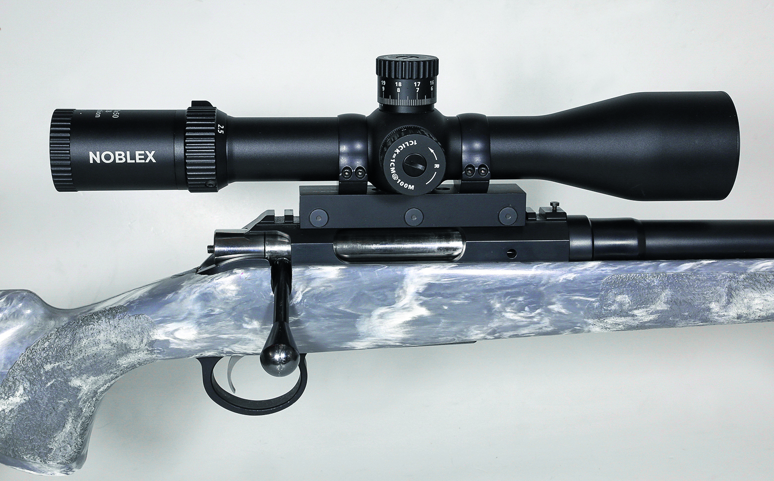 Gravierender Nachteil bei Absehen in der 1. Bildebene ist ihr sich mitvergrößerndes Absehen, das vor allem bei sehr hoher Endvergrößerung viel vom Ziel verdeckt. Um dem entgegenzutreten, hat Noblex ein neues Absehen entwickelt: Das MHR (Mil Hunting Reticle) ist so filigran, dass es auch bei maximaler Vergrößerung das anvisierte Objekt kaum abdeckt. Bei kleinen Vergrößerungen ähnelt es einem Plex-Absehen mit sehr feinem Fadenkreuz. Zoomt man hoch, werden  zusätzliche Markierungen und Zahlen sichtbar. So ein taktisches Absehen hilft, bei Weitschüssen den Geschossabfall auszugleichen. Bei Absehen in der 1. Bildebene geht das in jeder Vergrößerung – wenn für die Absehen-Schnellverstellung mal keine Zeit mehr bleibt, ein zusätzliches Hilfsmittel.
