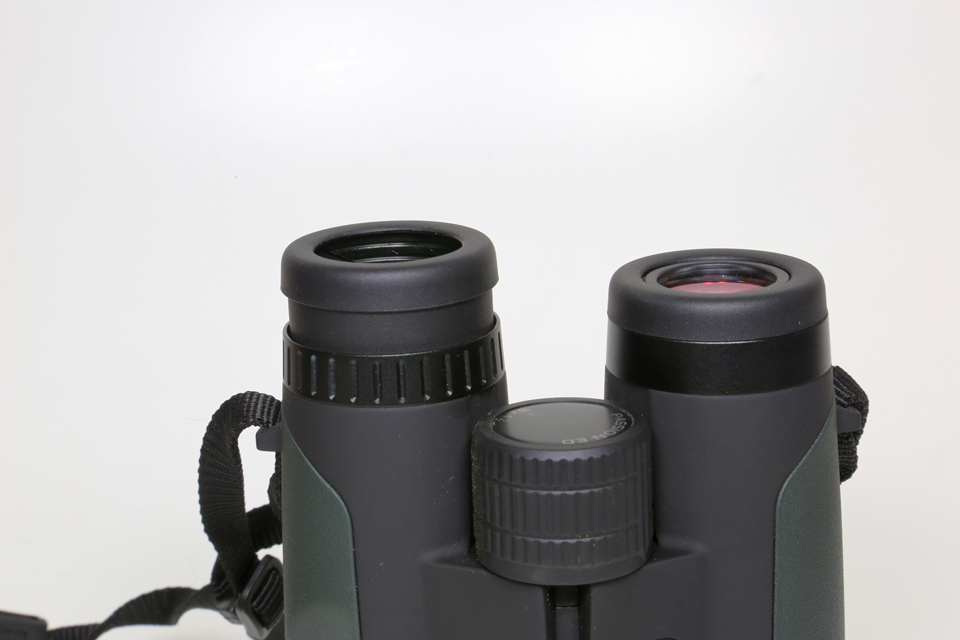 Die beiden Fernglashälften werden mit einer schmalen Hülsenbrücke verbunden, an der hinten die große Fokussierwalze angebracht ist. Diese gummierte Walze direkt vor den Okularen läuft weich und geschmeidig, vor der Hülsenbrücke bleiben mehr als 5 cm, um es auch noch einhändig gut greifen zu können.