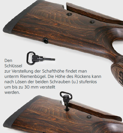 wirklich griffige Fischhaut hinzubekommen. Zusätzlich ist der Schaft noch mit einem höhenverstellbaren Rücken ausgestattet. Über zwei versenkt liegende Schrauben in der rechten Seite lässt sich der Rücken stufenlos in der Höhe um bis zu 30 mm verstellen und dem persönlichen Anschlag und der montierten Zieloptik anpassen – eine feine Sache für einen unverkrampften Anschlag. Das nötige Werkzeug, Sauers Mini Universal Schlüssel, findet man im Hinterschaft: Drückt man den Schnellverschluss des hinteren Riemenbügels und nimmt ihn ab, kommt der kleine Schlüssel zum Vorschein. Der steil stehende Pistolengriff ist beidseitig ballig verdickt, was den Schaft auch für Linksschützen nutzbar macht, zumal