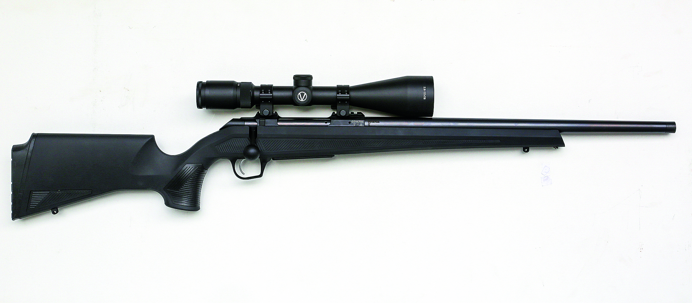 Die Alpha, das günstigste Modell der 600er-Serie, ist eine robuste Revierwaffe mit schwarzem, glasfaserverstärktem Polymer-Schaft. Es gibt sie in den Kalibern .223 Rem., 7,62 x 39, .308 Win., 6 mm CM, 6,5 PRC, .30 - 06, .300 WM, 8 x 57 IS und in vier Lauflängen (46/51/56/61 cm). Der kaltgehämmerte Lauf hat eine Semiweight-Kontur mit einem Mündungsdurchmesser von 18,5 mm, wenn man wie bei der RWJ-Testwaffe in .30-06 den 51 cm-Lauf wählt. Die handliche Büchse kommt damit auf eine Gesamtlänge von 103 cm und bringt 3 280 g auf die Waage.